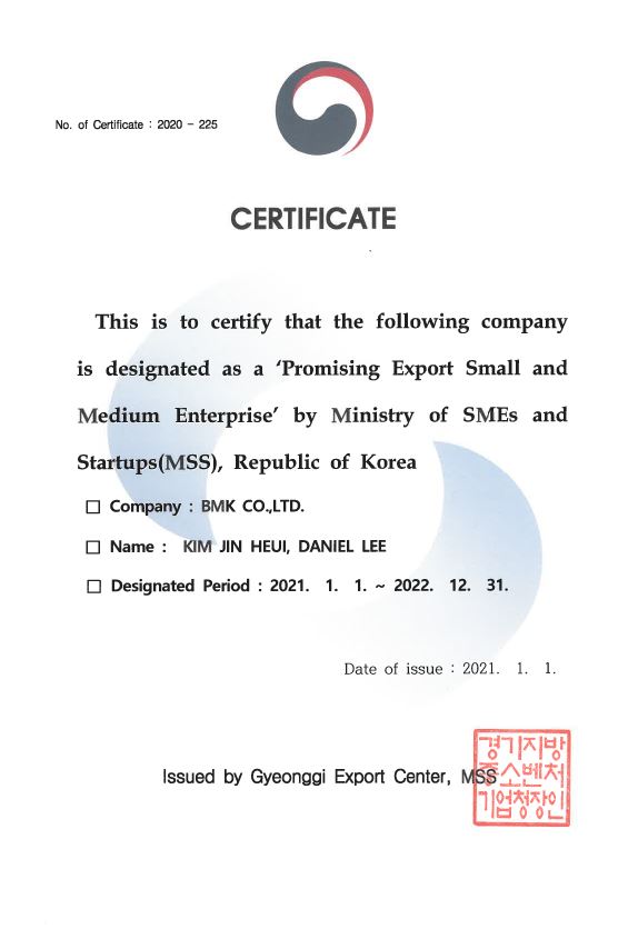 Promising Export Small and Medium Enterprise 페이지 정보 작성자 비엠케이 작성일21-01-22 10:56 조회2,913회 관련링크 이전글 다음글 목록 본문 'Promising Export Small and Medium Enterprise' by Ministry of SMEs and Startups(MSS), Republic of Korea 이전글 다음글 목록